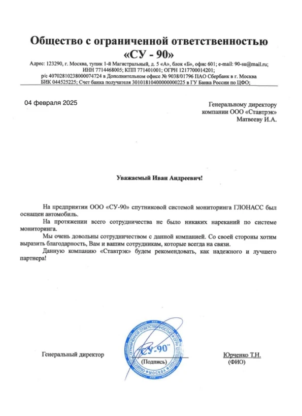 Сотрудничество с компанией «Ставтрэк» оставило самые приятные впечатления. Системы мониторинга ГЛОНАСС, которые установили в наши автомобили, работают безупречно. Все вопросы решаются оперативно, команда всегда внимательна и отзывчива. Благодарим за высокий профессионализм и рассчитываем на долгое успешное взаимодействие!